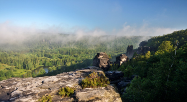 Projděte ty nejkrásnější a největší v našem údolí. Největší na české straně údolí je určitě Obří jeskyně u skalní věže Obr. K ní projděte po neznačené cestě, hledejte velkou věž, pod kterou jsou poházené obrovské balvany (viz obrázek). Do Obří jeskyně se musí z náhorní strany věže slanit. Poté dál podél Zpívajícího pramenu Singeborn k jámě Eisloch, kde bývá i v létě sníh, poblíž je také jeskyně Schwedenhöhole. Projděte vesnicí Bielagrund až k jeskyním Franzosenloch a soustavy jeskyní u Sachsenstein. Pokochejte se výhledem na Johanově vyhlídce, pokračujte dál k jeskyni Bennohöhle. Po její prohlídce směrem pod skalami až k Trpasličí jeskyni. Do první části jeskyně můžete vstoupit i pěšky, dál se ale pokračuje s lanovým jištěním. Trpasličí jeskyně je Vaší poslední zastávkou zpět do hotelu.