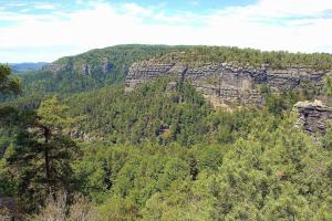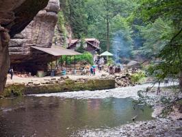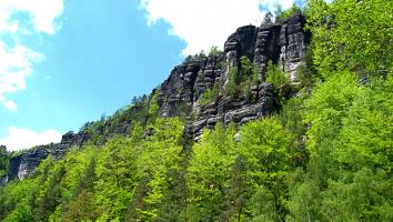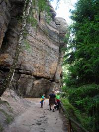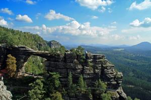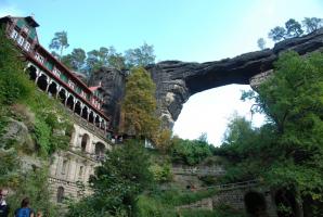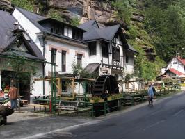 Autem se z hotelu vypravte na Mezní louku, cesta má cca 37 km (přes Děčín a Hřensko). Mezní louka je ideálním výchozím bodem pro výlet za největšími atrakcemi Českého Švýcarska – Pravčickou bránu a soutěsky Kamenice – Divokou a Edmundovu soutěsku. Z Mezní louky po modré značce půjdete cca 20 minut, poté vstoupíte do Divoké soutěsky. Po pravém břehu Kamenice procházíte soutěskou až k přístavišti pramic, dále můžete pokračovat pouze po vodě cca 500m. Kolem Mezního můstku, kde se můžete ve zdejším bufetu občerstvit dojdeme až k přístavišti pramic v Edmundově soutěsce. Po projížďce s výkladem kolem známého uměle vybudovaného vodopádu, vás čeká průchod soutěskami ve sklaních tunelech a po lávkách v soutěsce až do Hřenska.Z Hřenska, kolem restaurace Klepáč mírně stoupáte po červené turistické značce až k rozcestí Tři prameny. Na tomto rozcestí se dejte po červené vlevo, kde začíná výstup k Pravčické bráně. Pod strmými stěnami pískovcového masivu stoupáme až Malému Pravčickému kuželu k závěrečnému zdolání visutého mostu a tunelu ve skále. Po prohlídce Pravčické brány, Výletního zámečku Sokolí hnízdo a zdejších vyhlídek se vydejte po červené značce skalním traversem cca po 70 minut dlouhé Gabrielině stezce. Tato krásná lesní cesta traversuje kolem hlubokých roklí s hezkými výhledy, po cestě uvidíte další známé skalní útvary Českého Švýcarska – věž Homole, nebo Velký Pravčický kužel. Okruh uzavíráme zpět na Mezní louce, poblíž restaurace a pensionu U Fořta.