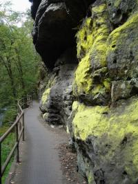 Mezní louka – rozcestí Divoká soutěska – Divoká soutěska – Mezní můstek – Tichá soutěska – Edmundova soutěska – Hřensko Hotel Klepáč – Jeskyně českých bratří – Pravčická brána – Velký pravčický kužel – Homole – Mezní louka