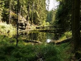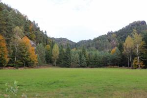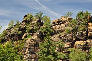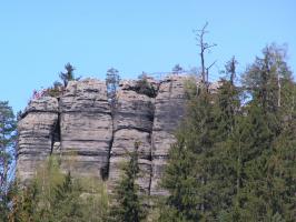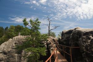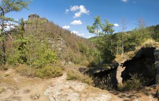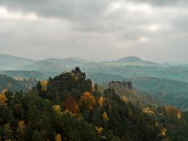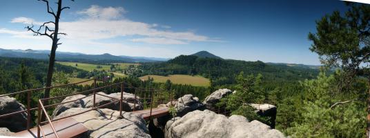Z malebné vesnice Vysoká Lípa, brány do středu Českého Švýcarska míříme na sever k loupežnickéhmu hradu, Šaunštejnu. Malou zajímavostí o vesnici je, že se zde natáčela pohádka Pyšná princezna. Po žluté turistické značce dojdeme až ke skalnímu hradu Šaunštejn, který se s nádhernou vyhlídkou do kraje vypíná nad Vysokou Lípou. Skalní hrad sloužil v 15.století, než byl opuštěn, svým majitelům Berkům z Dubé k loupeživým výpravám po okolí. Proto se Šaunštejnu přezdívá Loupeživý hrad. Z hradu si udělejte malou zacházku (cca 300m) po červené a navštivte Malou Pravčickou bránu, sestru té větší. Oproti svému většímu sourozenci je Malá Pravčická brána trochu „kapesní“ velikosti – vysoká je cca 2,3m a široká kolem 3 metrů. Nicméně i tak stojí za vidění. Po Naučné stezce Jetřichovické stěny (červená turistická značka) procházíme nad Vlčím dolem kolem skalních věží (čeká na Vás např. Golem, Čmelák nebo Švihák lázeňský) až k Ostrohu, resp. Rudolfově kameni. Ten je pojmenován po knížeti Rudolfu Kinském, který zde nechal vybudovat první útulek v altánu na vrcholu vyhlídky. Rudolfův kámen představuje jednu z TOP vyhlídek Českého Švýcarska a Jetřichovického skalního města. Pokračujeme po červené značce dále po Naučné stezce až k Vilemínině stěně, pojmenované po Vilemíně, kněžně Kinské, matce majitele panství. Z Vilemíniny stěny je úžasný výhled jak na Jetřichovice tak na Růžovský vrch. Červená značka nás dovede k jednomu ze symbolů Českého Švýcarska, Mariině skále. Na vrcholu skály stojí vyhlídka s altánem. Závěrečným sestupem do obce Jetřichovice opouštíme Jetřichovické skalní město. U památného dubu v Jetřichovicích se napojujeme na žlutou značku, která nás údolím Jetřichovické Bělé dovede nejprve ke Starému mlýnu s mlynářským muzeem a poté až k Dolskému mlýnu. Po prohlídce zříceniny mlýna se stoupající modrou značkou vracíme zpět do Vysoké Lípy.